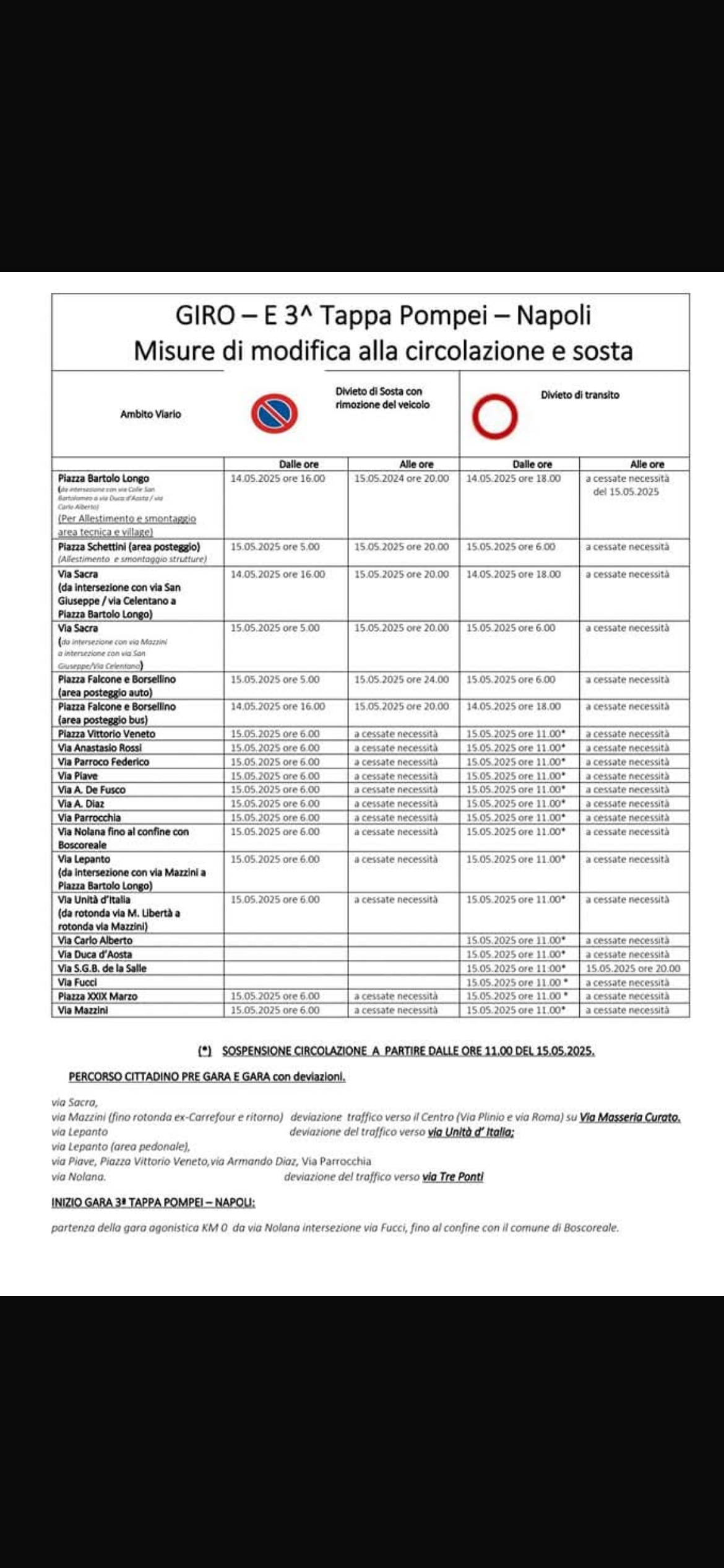 La tappa Pompei-Napoli partirà alle 12:10 di giovedì 15 maggio. La circolazione sarà sospesa in tutte le strade del centro cittadino dalle 11:00 circa e fino al totale passaggio della corsa e della carovana pubblicitaria che la precede, presumibilmente previsto alle ore 14:00. In questa fascia oraria sarà impossibile raggiungere la Casa di Cura Maria Rosaria se non a piedi o tramite trasporto pubblico, o in caso di primo soccorso ostetrico. Sono previsti presidi delle forze dell’ordine e delle Polizie Municipali agli incroci che consentono l’accesso ai tratti stradali chiusi al traffico.